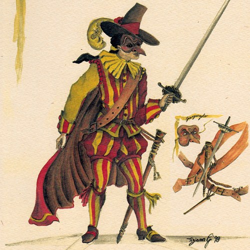 Coviello è una maschera che risale al Cinquecento ed è una tra le maschere teatrali che più sfugge ad una definizione. Né il suo ruolo scenico né il costume presentano infatti nel tempo la regolarità che consentirebbe di ancorarli a un “tipo”. Il suo nome deriva per contrazione da Iacoviello, corrispondente in italiano a Giacometto. La sua parte d’attore nella commedia dell’arte, cambia sovente secondo la trama e a seconda delle esigenze della commedia e delle caratteristiche dell’interprete; a volte è un servo altre un bravo, oppure un buon padre di famiglia o avido albergatore, Coviello venne definito, la maschera delle maschere, la traduzione scenica del tema della variazione affidato a un personaggio inafferrabile e imprevedibile. “Coviello, cui è talvolta attribuito un cognome variabile quale Citrullo, Citrulli, Ciavala, Gazzo o Cardocchia, si presenta come una figura poliforma, da mille volti e da molteplici atteggiamenti.” Il costume del personaggio non è ben definito. In alcune incisioni del Seicento di Francesco Bertarelli viene raffigurato con lunghi pantaloni attillati allacciati sui fianchi, un corpetto aderente e una corta mantella. Indossa anche una maschera nera con un naso enorme sopra il quale poggiano degli occhiali smisurati. Elemento costante anche un mandolino.