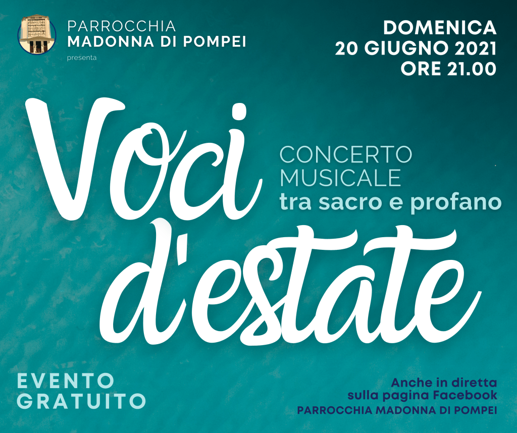 In occasione della festa della musica, domenica 20 giugno 2021 alle ore 21.00, si terrà presso la Parrocchia Madonna di Pompei in Catanzaro, il concerto musicale VOCI D’ESTATE.