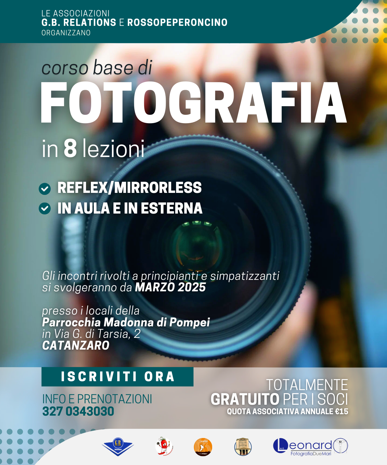 Le associazioni “G.B. Relations” e “RossoPeperoncino” sono entusiaste di presentare il loro nuovo corso di fotografia, un’opportunità imperdibile per tutti gli appassionati di immagini e creatività. Questo corso, strutturato in otto lezioni coinvolgenti, è stato progettato per accompagnare i partecipanti in un viaggio completo nel mondo della fotografia, dalla teoria alla pratica.
